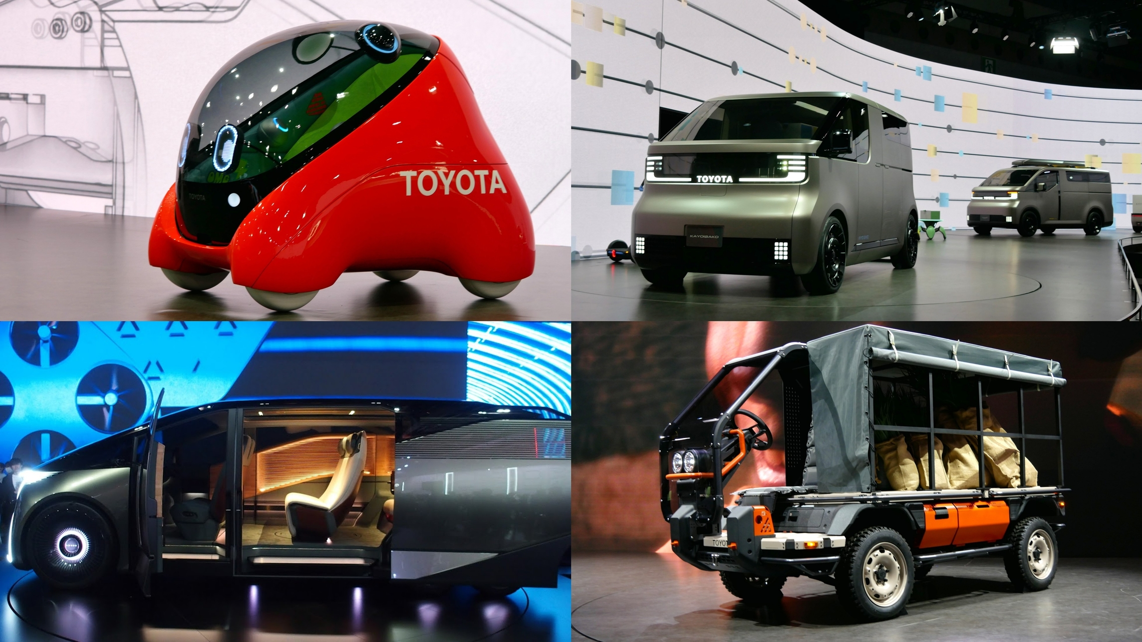 愛らしい外観のお子さん専用のAIモビリティ、ミニマルでありながら武骨さも感じさせるカヨイバコとハイエースコンセプト、6輪のタイヤで広々としたレクサスのLSコンセプト、ほかにも多種多彩な展示がされていました。