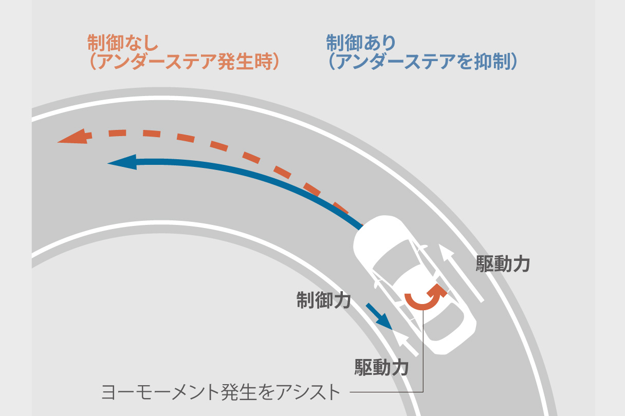 ワインディング走行等のシチュエーションにおいて、ブレーキ制御により内輪の駆動力を調整し、コーナリングをアシストします。