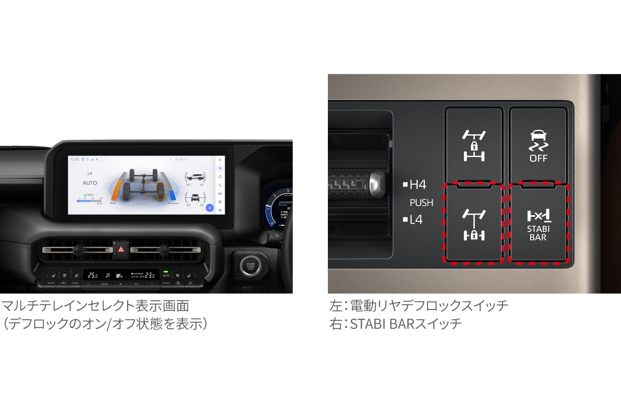 後輪のどちらかが岩石路や砂地、ぬかるみなどでスタックした際、後輪左右を直結。空転する反対側のタイヤに駆動力を伝え、走破性を高めるシステムです。