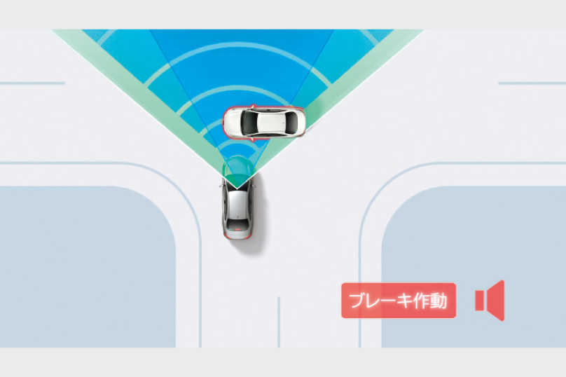 交差点に進入する際、交差する車両や自動二輪車をミリ波レーダーと単眼カメラで検出。ブザーと表示で衝突の可能性を知らせると同時に、プリクラッシュブレーキを作動。衝突回避または被害軽減をサポートします。
