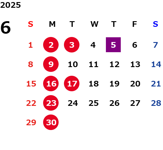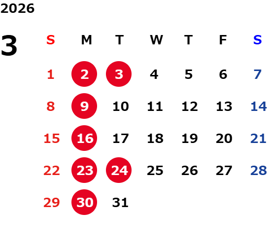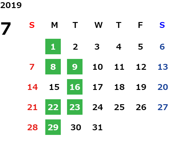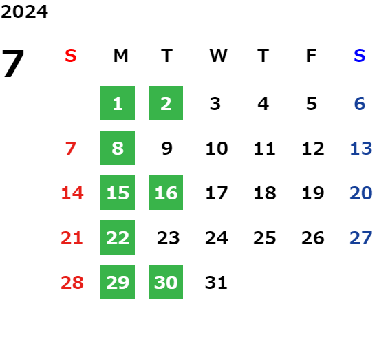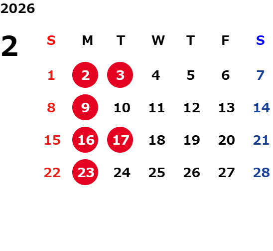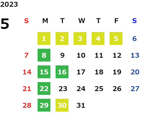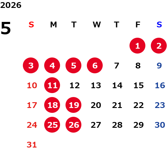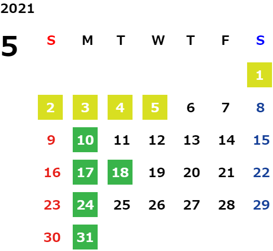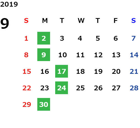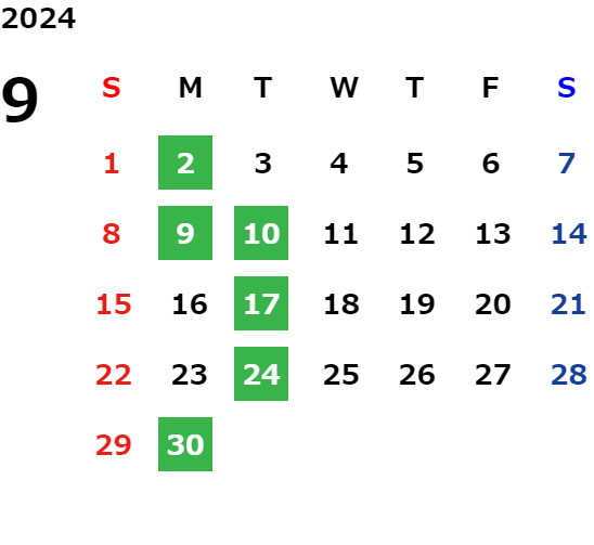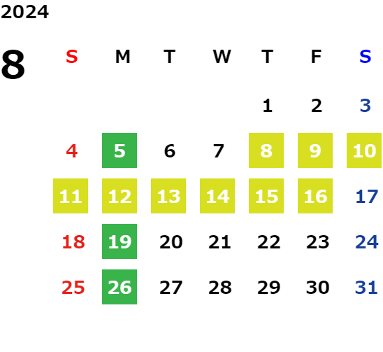 月曜日、一部火曜日、GW・お盆・年末年始